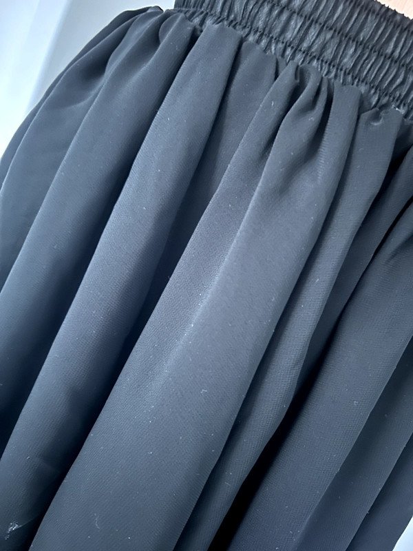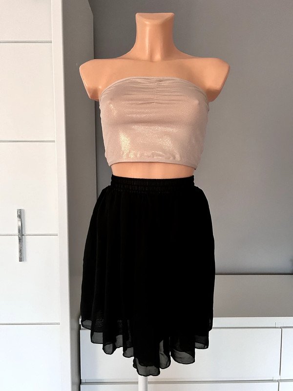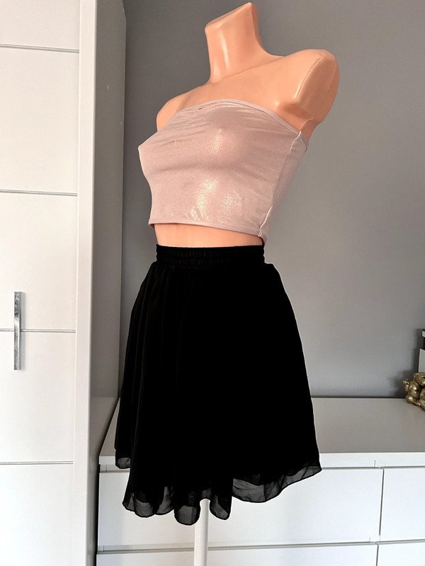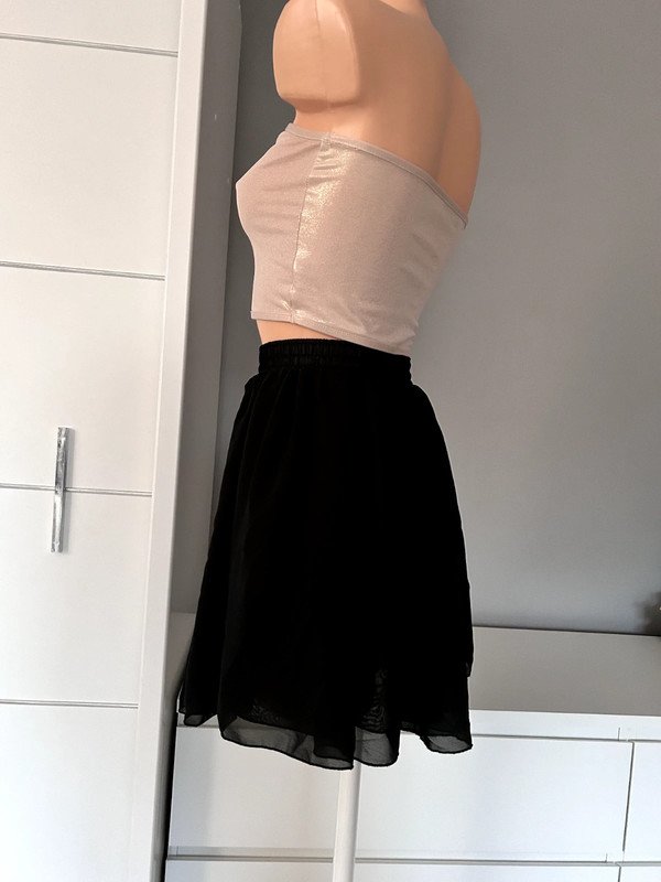Czarna spódniczka z wysokim stanem kropka Ma gumkę w talii, dzięki temu idealnie dopasowuje się do sylwetki i nie odstaje. Niestety nie posiada metki z rozmiarem ale moim zdaniem jest to XS. Dzięki temu, że jest rozkloszowana to świetnie zagrywa mankamenty. Ma wysoki stan.
