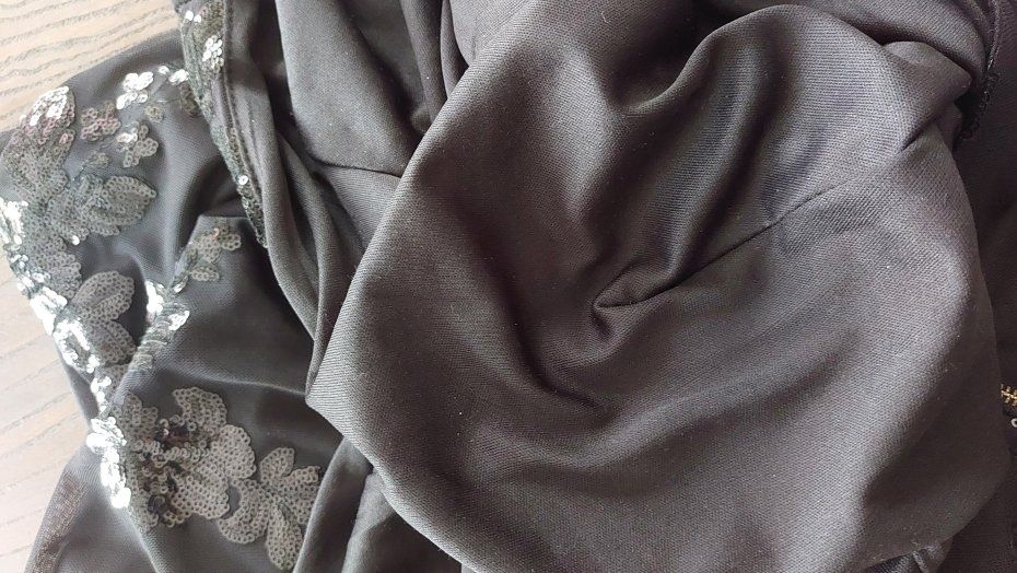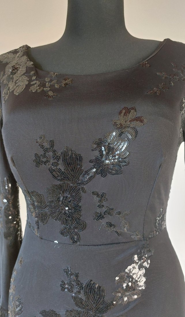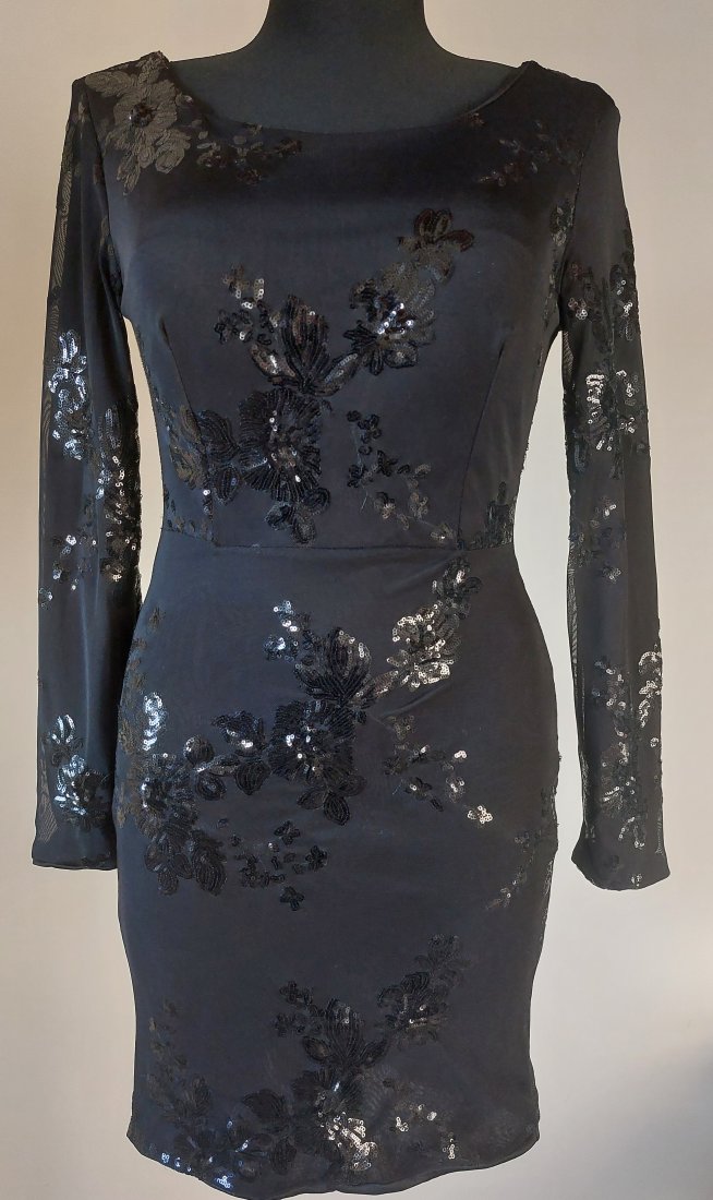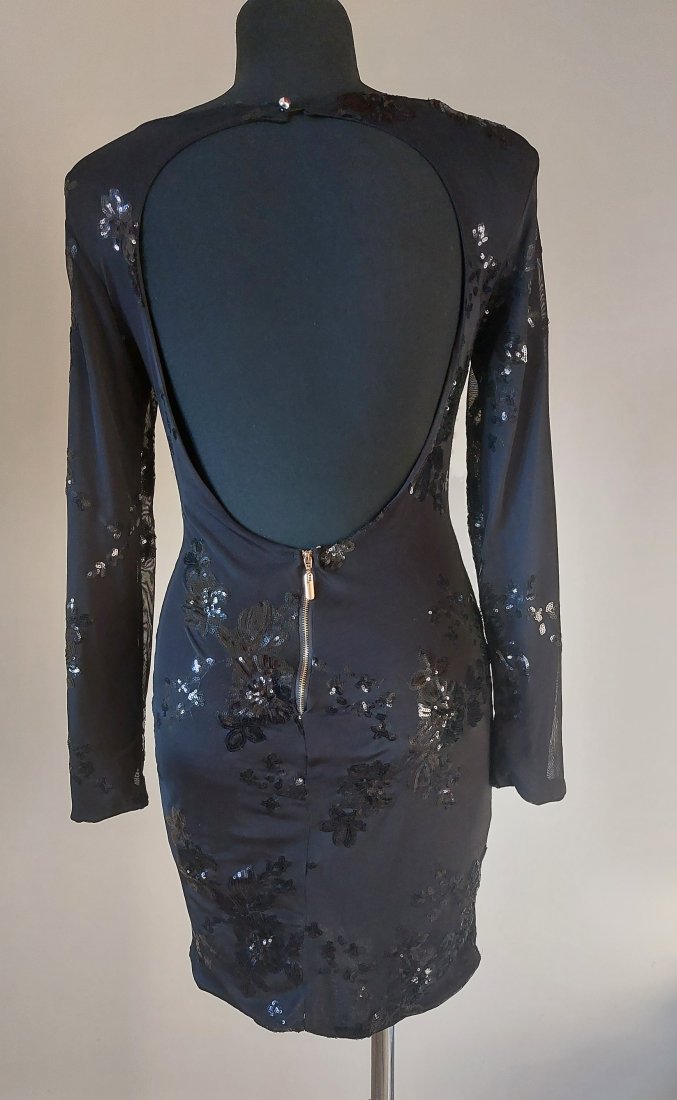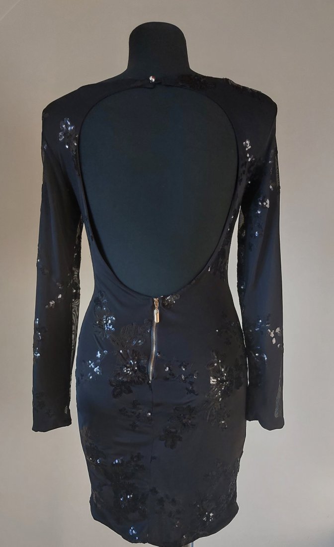 Włoska sukienka mini z odkrytymi plecami, ozdobiona cekinami, zapinana na zamek i guzik, wewnątrz elastyczna podszewka, z przodu wszyte usztywniane miseczki.