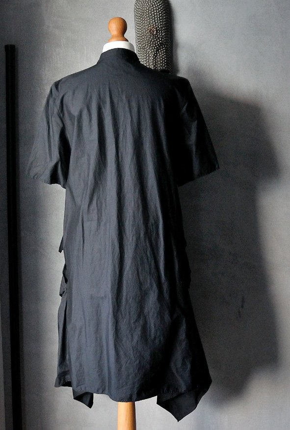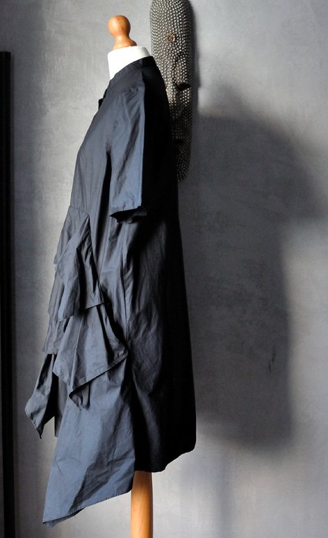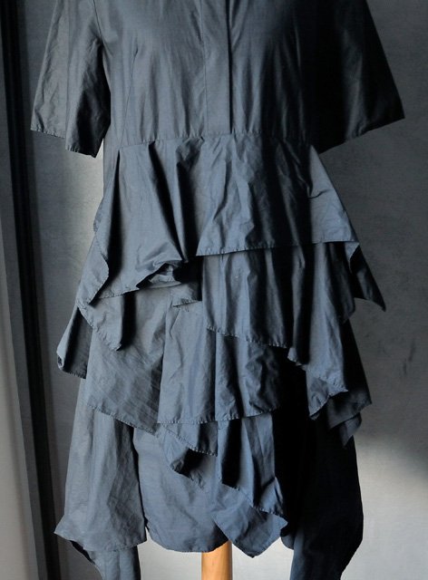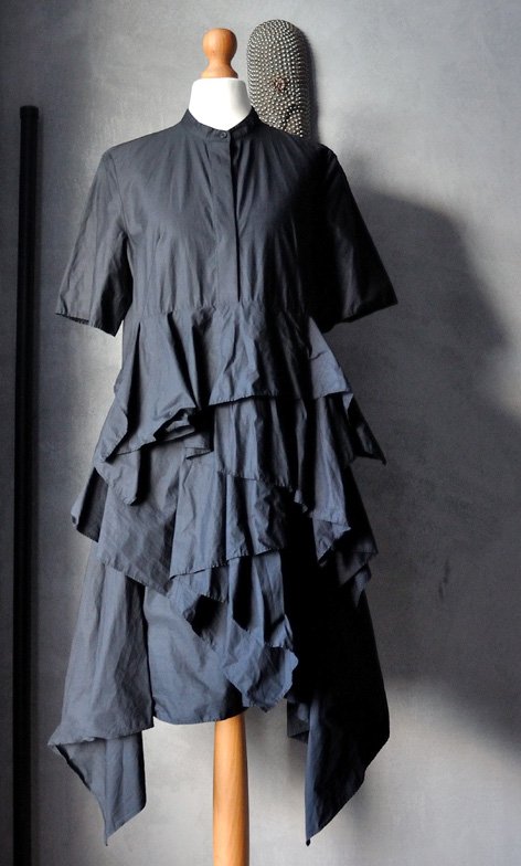 Casualowy, ale mocno niebanalny fason. Góra ma krój klasycznej koszuli z krótkim rękawem i stójką. Guziki ukryte pod listwą materiału. Impreza zaczyna się na wysokości talii: cały przód stanowią duże, asymetryczne falbany. Pod falbanami, na wysokości bioder (po bokach) ukryte kieszenie. Sukienka bardzo rozkloszowuje się ku dołowi. Spód asymetryczny - boki są dłuższe niż środek przodu i tyłu.