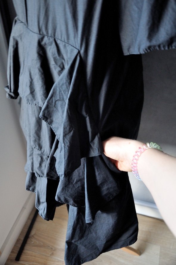 Uszyta z niezbyt grubej, trzymającej kształt i fason bawełny (jakby koszulowej, lekko szeleszczącej). Sukienka jest czarna.