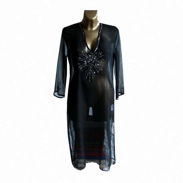 Czarna, prześwitująca tunika ozdobiona srebrnymi cekinami.