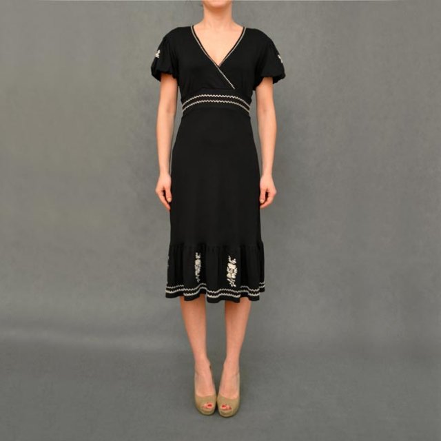 Czarna sukienka z białymi detalami - haftowane szlaczki, wykończenia, kwiatuszki. Dekolt kopertowy, dół wykończony falbanką. Polecam.