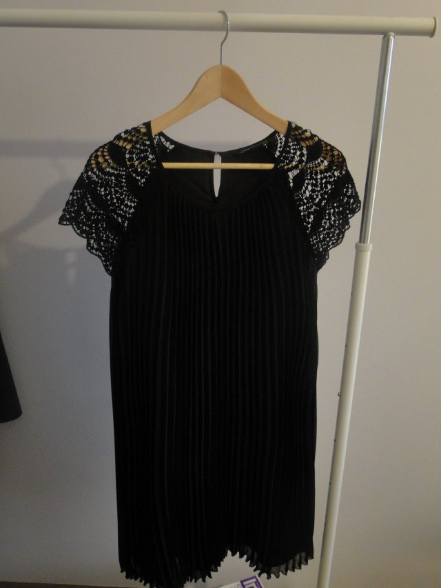 Plisowana sukienka marki ZARA , rękawki wykończone szydełkową koronką , niestety gdzie nie gdzie od ścisku na wieszakach w mojej szafie, są urwane ( można złapać to łatwo czarną nitką , nie będzie naprawdę widoczne, ja nie mam niestety do takich rzeczy drygu)