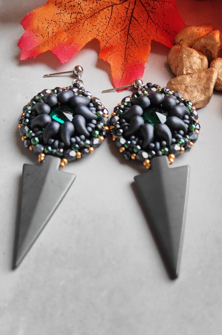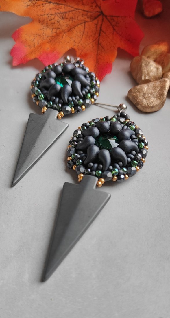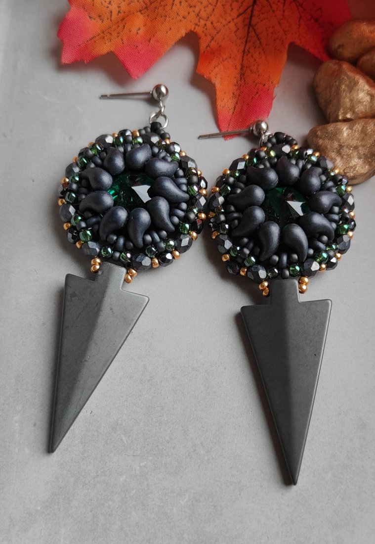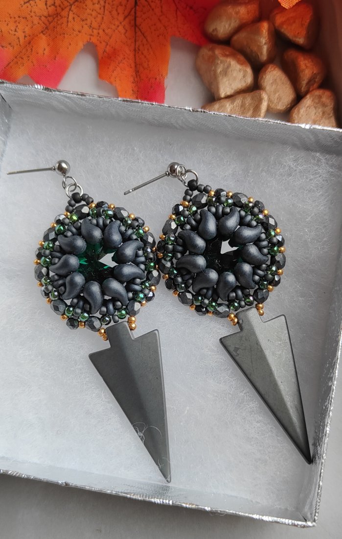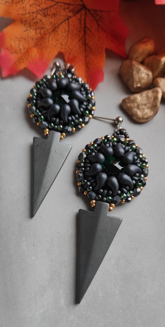 ,, czarne groty,, to kolczyki utrzymane w kolorystyce czerni i złota, wykonane z matowych czarnych koralików które oplatają zielone serce z rivoli. Całości kolczyka dopełnia matowy grot z hematytu. Kolczyki zawieszone są na ozdobnych biglach typu sztyft wykonanych ze stali szlachetnej.
