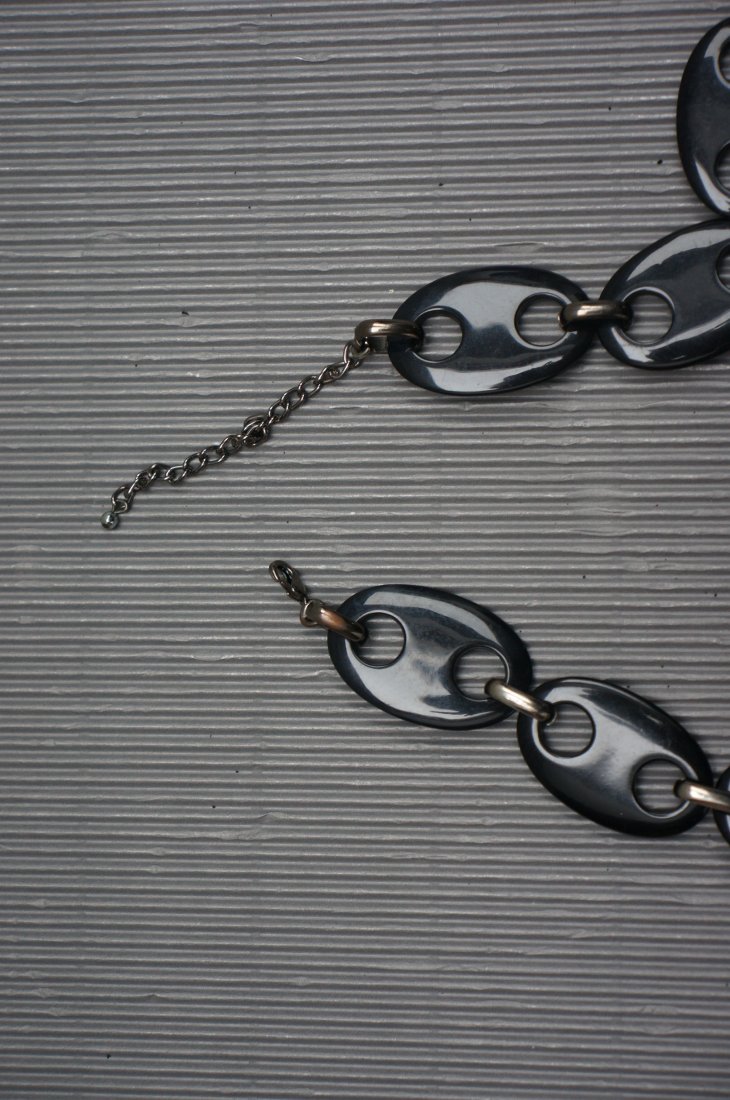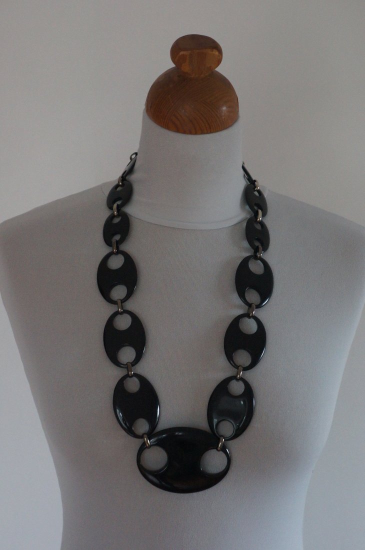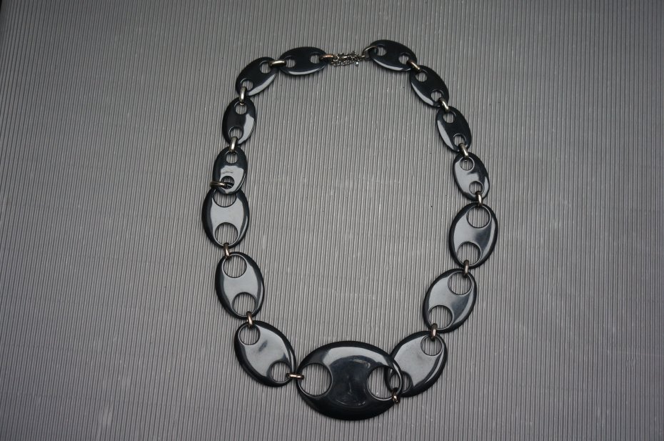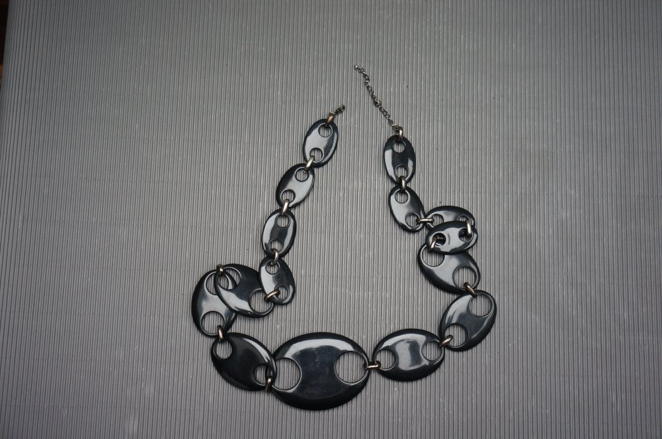Elegancki, czarny naszyjnik. Bardzo ładnie się prezentuje. Wykonany z tworzywa i metalu. Stan bardzo dobry.