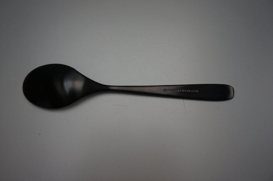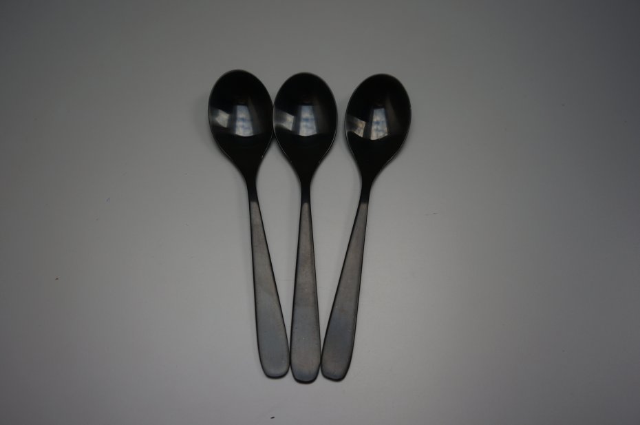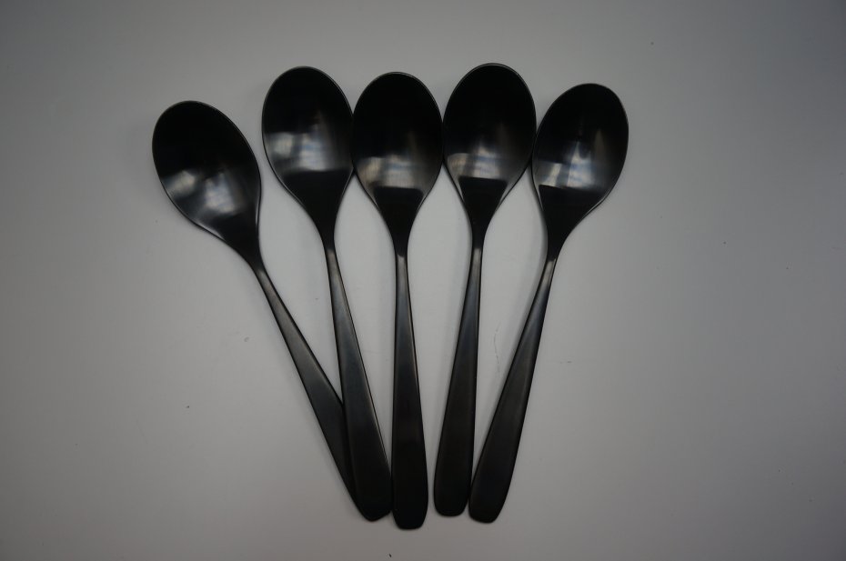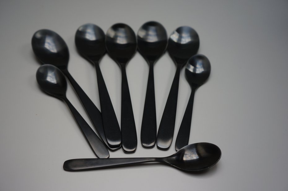 Komplet łyżek (stołowe - 5 szt., małe - 3 szt.) wykonanych ze stali nierdzewnej, platerowanej na czarno. IKEA. Stan bardzo dobry.