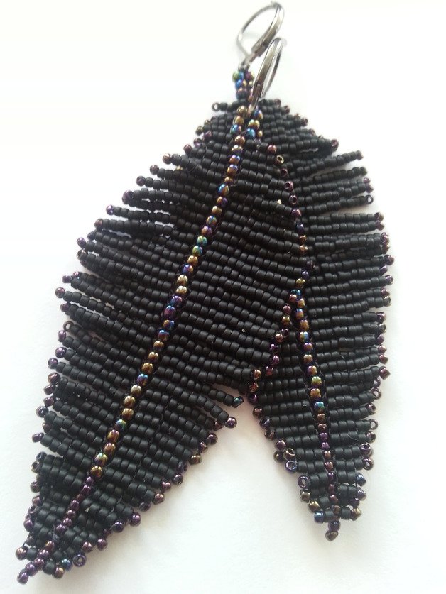 Kolczyki wykonane pracochłonną techniką beading z koralików Toho w kolorze matowym czarnym i tęczowym zawieszone na miedzianym biglu angielskim w kolorze rodowanego srebra.