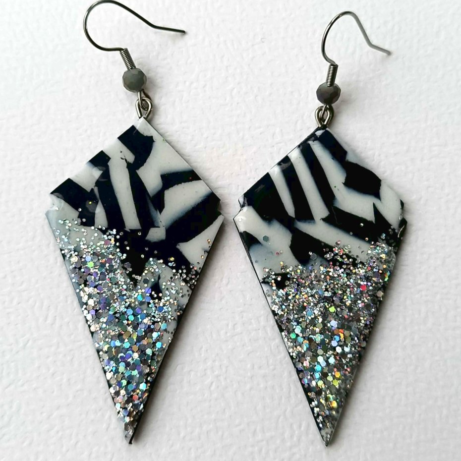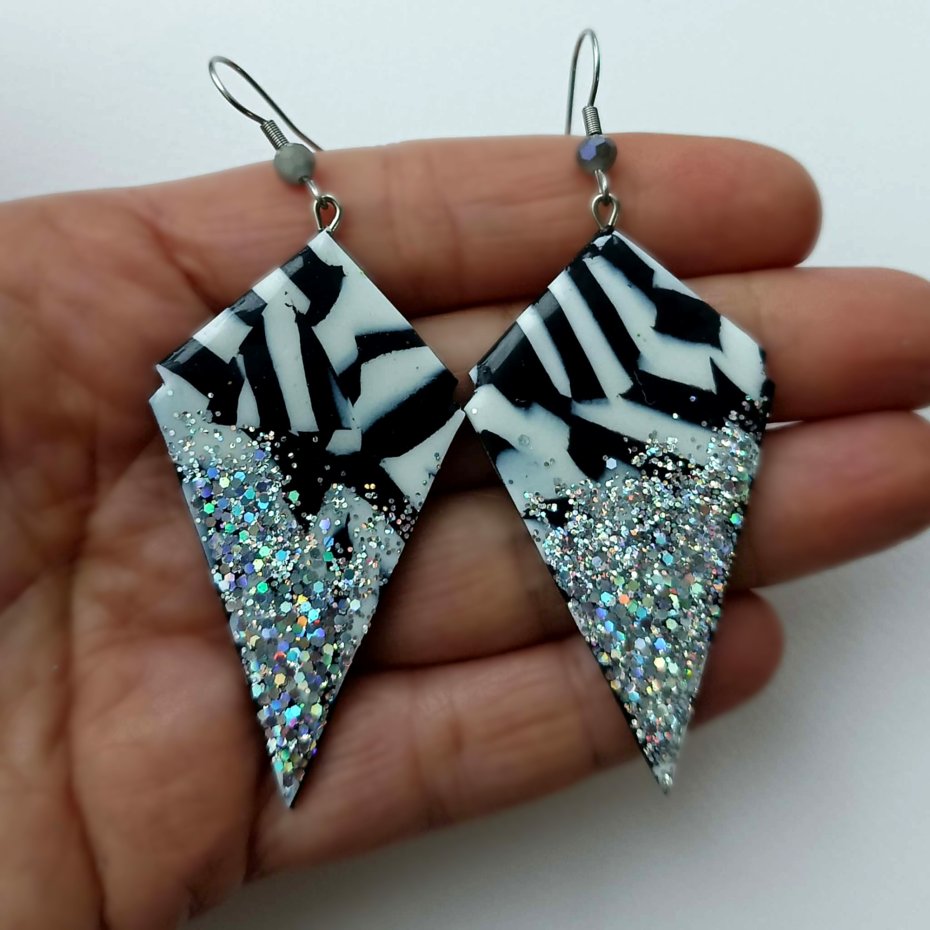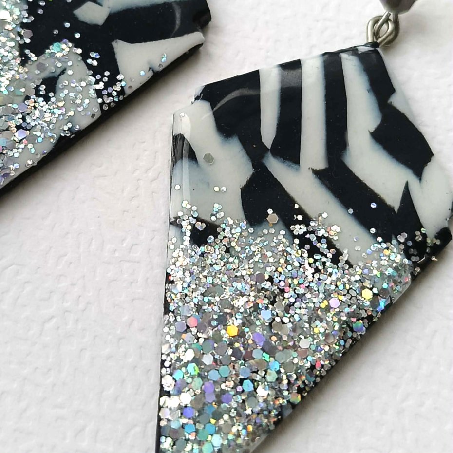Efektowne, czarno-białe kolczyki typu statement, które przyciągają spojrzenia i dodają stylizacji wyjątkowego charakteru. Połączenie kontrastowych kolorów z holograficznym srebrnym brokatowym połyskiem sprawia, że kolczyki pięknie odbijają światło i idealnie sprawdzą się na imprezy, festiwale, karnawał czy wieczorne wyjścia.