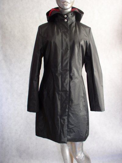 Płaszcz przeciwdeszczowy z czerwona podszewką z ocieplaczem.Kaptur doszyty na stałe.Zapinany na napy.Z przodu dwie pionowe kieszenie.Rękaw długi,prosty.Stan bardzo dobry.Rozmiar 36-38.Długość 91 cm.pod pachami 100 cm.