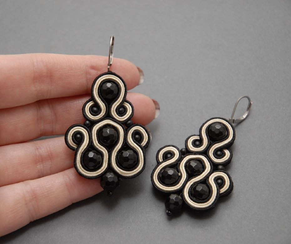 oferuję kolczyki zrobione techniką sutasz, ozdobione fasetowanymi onyksami i małymi perełkami seashell.