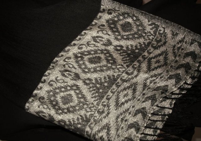 Piękny czarny szal zakończony geometrycznym wzorem ze złotą nitką. Bardzo subtelny.