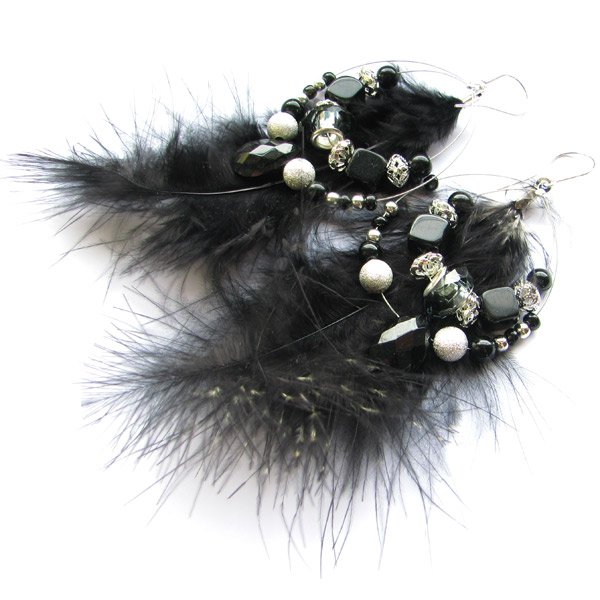 Niezwykłe kolczyki wykonane z z czarnych piórek marabuta. Materiały: piórka, perły, szlifowane korale modułowe Swarovski, korale szklane i kostki onyksu, srebrne, srebrzone i metalowe przekładki, linka jubilerska i srebrne bigle zgodne z normą EN1811 i EN12472 (BEZ NIKLU). Długość piór 13 cm, długość koralików zawieszonych na lince 7 cm. Wszystkie kolczyki pakuję w bezpieczny sposób. POLECAM!!!.