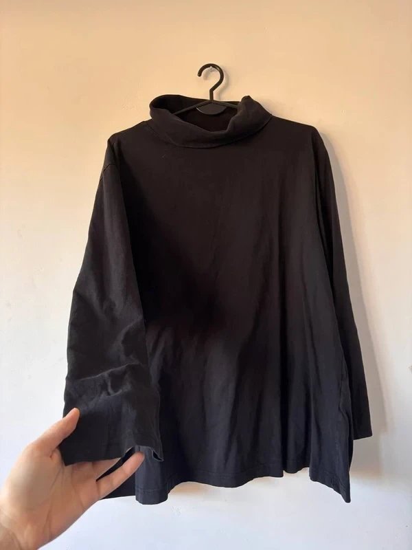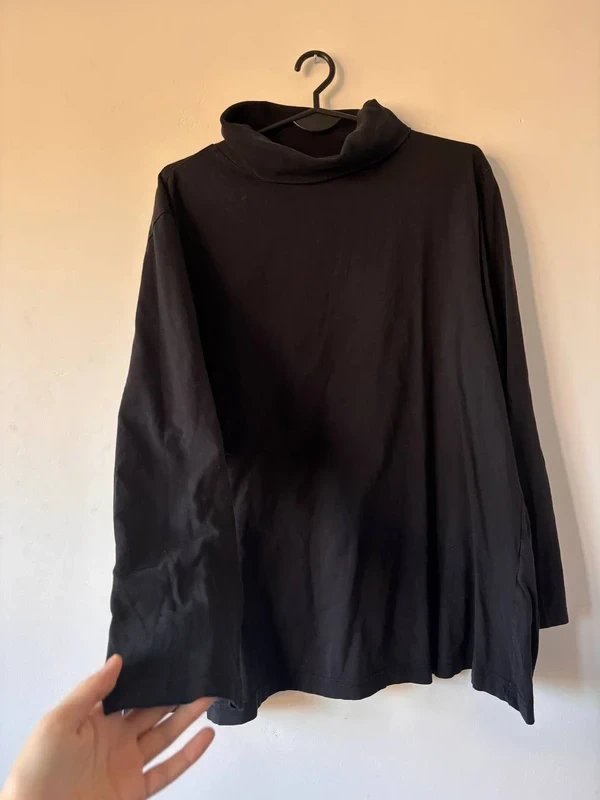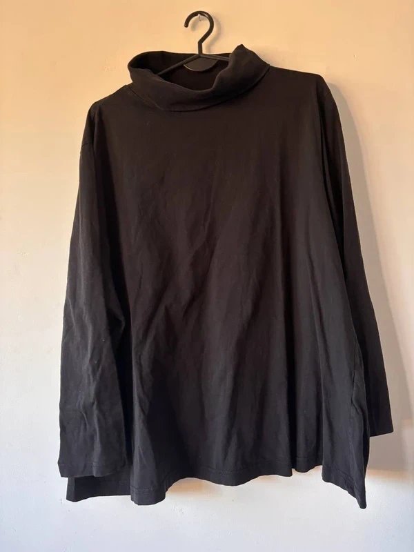 Prosty krój z luźnym golfem — świetna baza pod marynarkę, kamizelkę lub sweter.