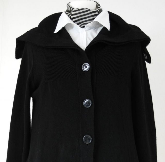 Rozpinany z rozłożystym kołnierzem, który można traktować jak golf . Kieszenie wsuwane. Rękawy przy mankietach lekko przymarszczone.