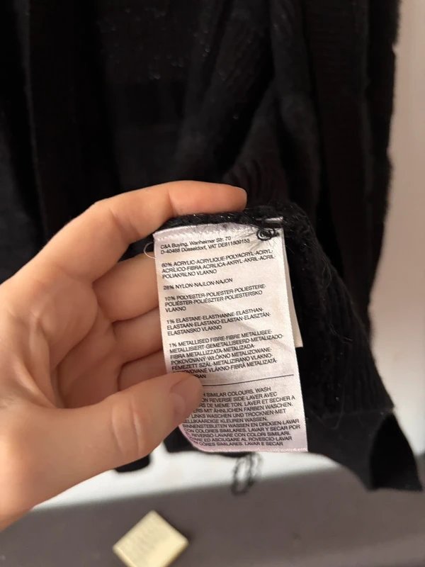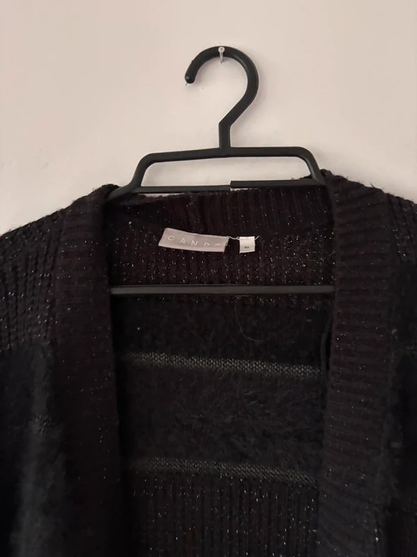 Miękki czarny kardigan marki Canda (C&A) w rozmiarze XL, wykonany z mieszanki włókien z delikatną nitką połyskującą. Model wyróżnia się efektownymi pasami o zróżnicowanych fakturach – gładkich, prążkowanych i puszystych. Swobodny fason. Rękawy długie, materiał elastyczny i przyjemny w dotyku.