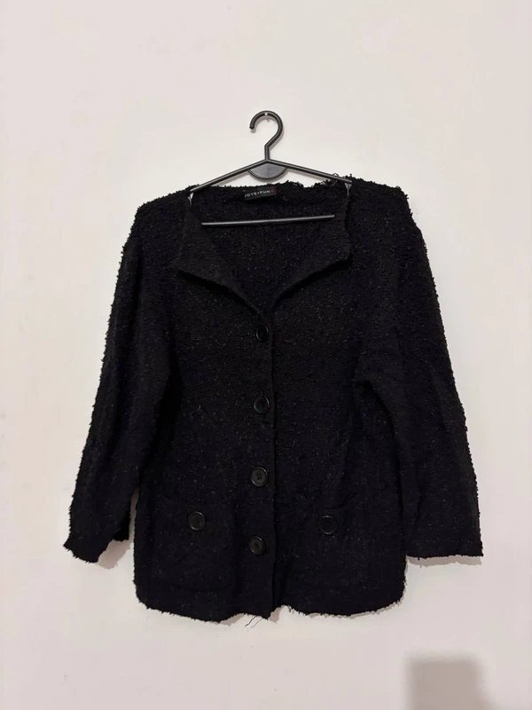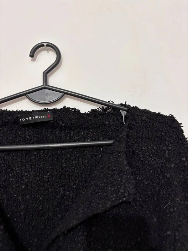 Stylowy czarny kardigan JOY+FUN o eleganckiej, lekko boucle fakturze. Model zapinany na duże guziki, z kołnierzem i praktycznymi kieszeniami. Idealny do biura, na co dzień i do stylizacji minimalistycznych. Materiał miękki i komfortowy.