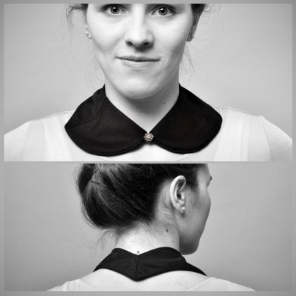 Kołnierzyk wykonany z czarnej dzianiny. Z przodu zapinany na ozdobny guziczek.