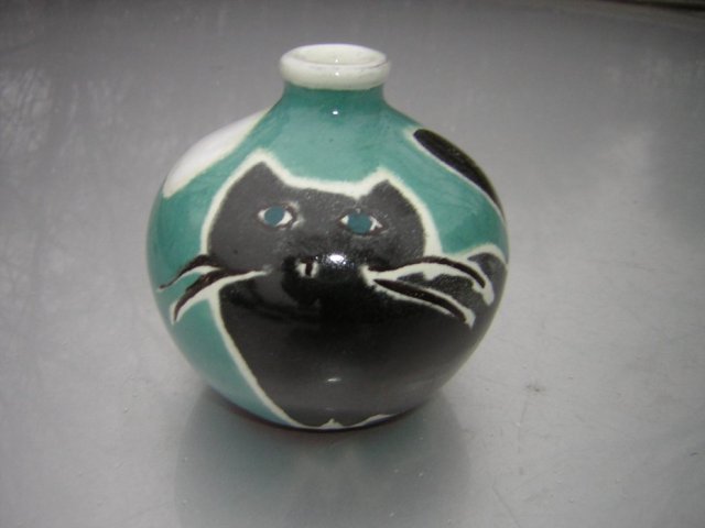 Oryginalna, autorska ceramika. Uroczy, ręcznie formowany i ręcznie malowany, gliniany wazonik w kocie yin-yang :) Sygnowany autorsko. Ciekawa prosta forma i wyraziste kolory ręcznie, podszkliwnie malowanego wzory. Wewnątrz szkliwiony, użytkowy. Pękatość około 7,5 cm dół 4 cm g02 cm wys. 7,5 cm Stan zachowania bardzo dobry.