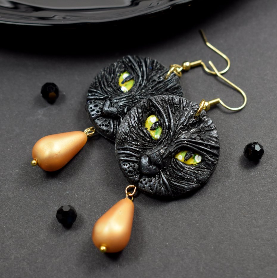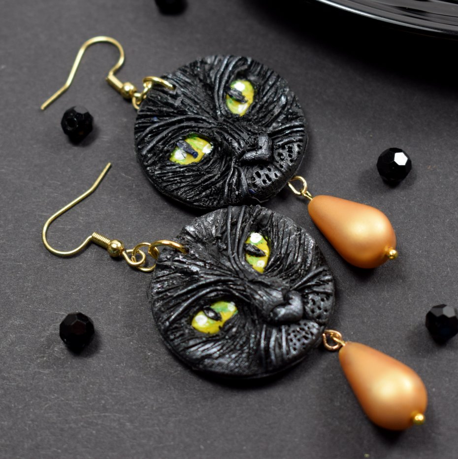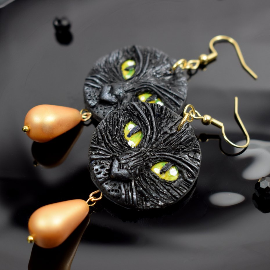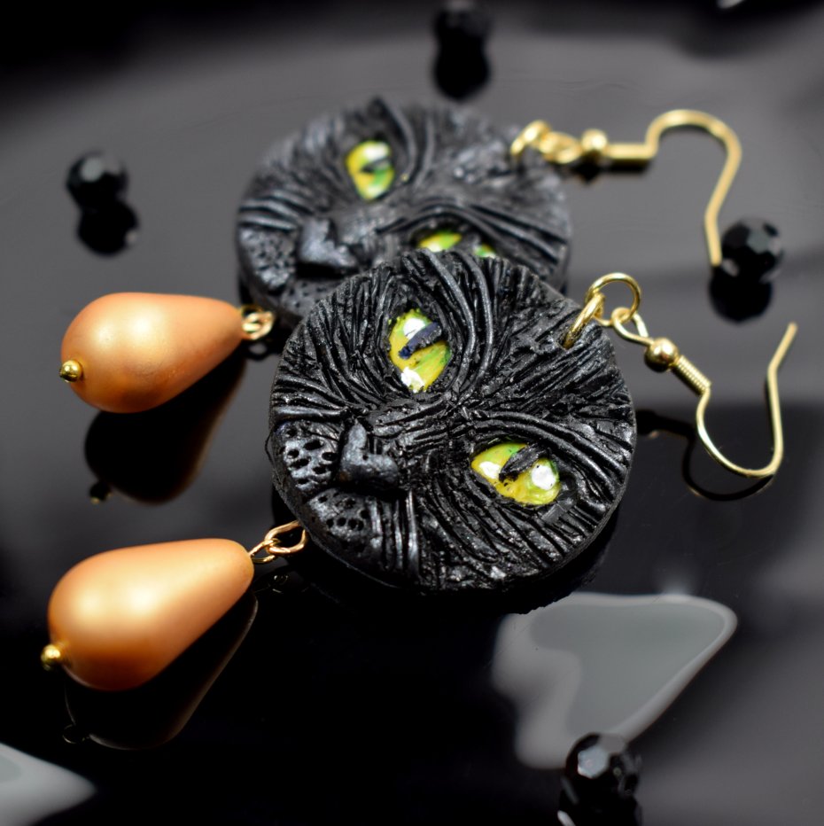Czarny kot - długie kolczyki ze złotymi kropelkami - biżuteria z charakterem