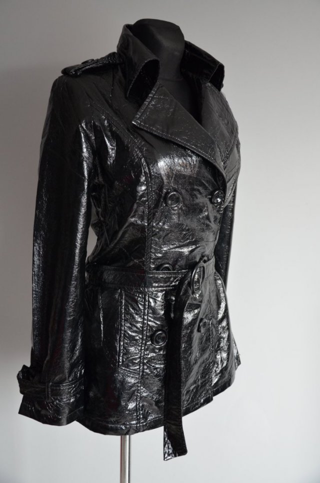 Czarny, lakierkowy kolor. Klasyczny krój z dekoltem, dwurzędowo osadzonymi dużymi guzikami. W pasie ściągany paskiem, po bokach kieszenie. Lekki, na podszewce, nieprzemakalny.