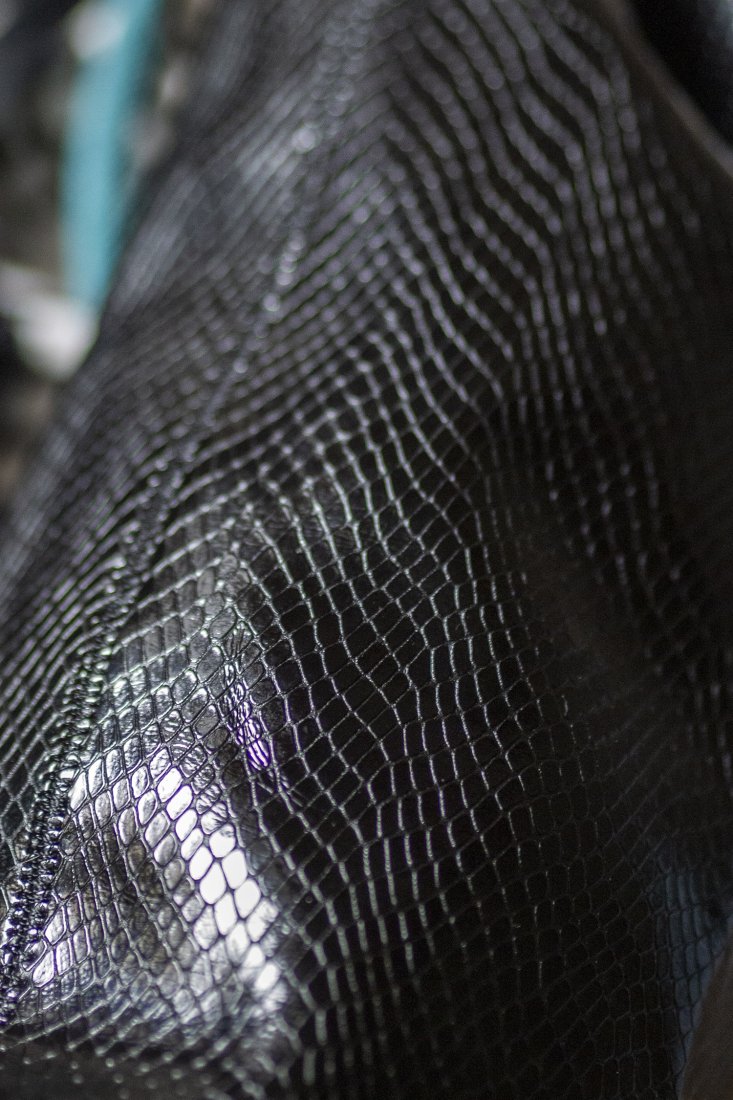 Plecak worek wykonany z czarnej tłoczonej ekoskóry w wężową łuskę. Jego kształt sprawia, iż idealnie nadaje się na pokrowiec na matę do jogi.