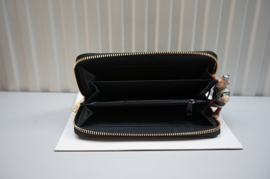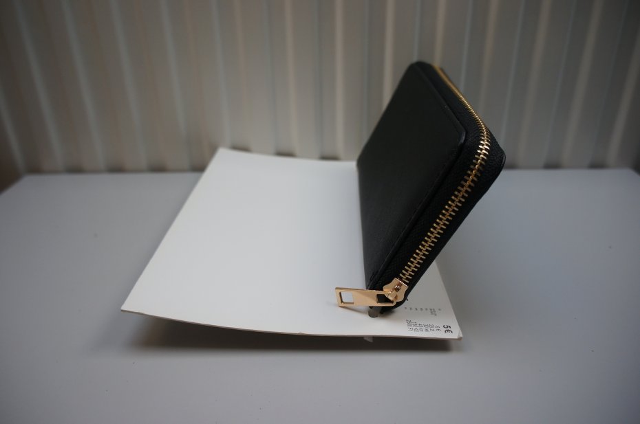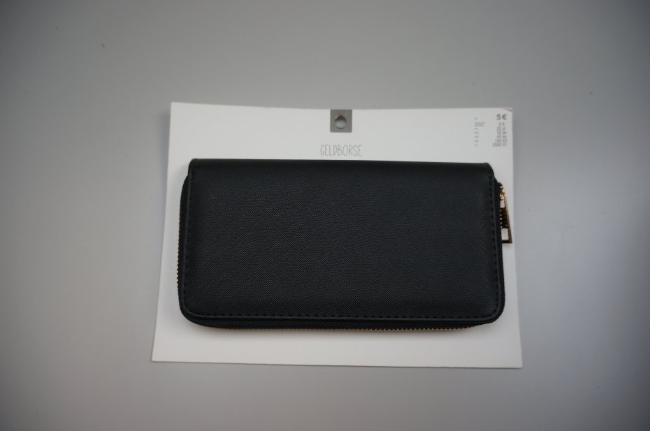 Damski portfel zapinany na suwak. Wewnątrz trzy duże przegrody na banknoty i jedna na bilon, zapinana na suwak. Ponadto miejsce na karty i inne drobiazgi. Wierzchnia strona - 60% poliuretan, 40% poliester. Kolor czarny. Nowy. Stan bardzo dobry.