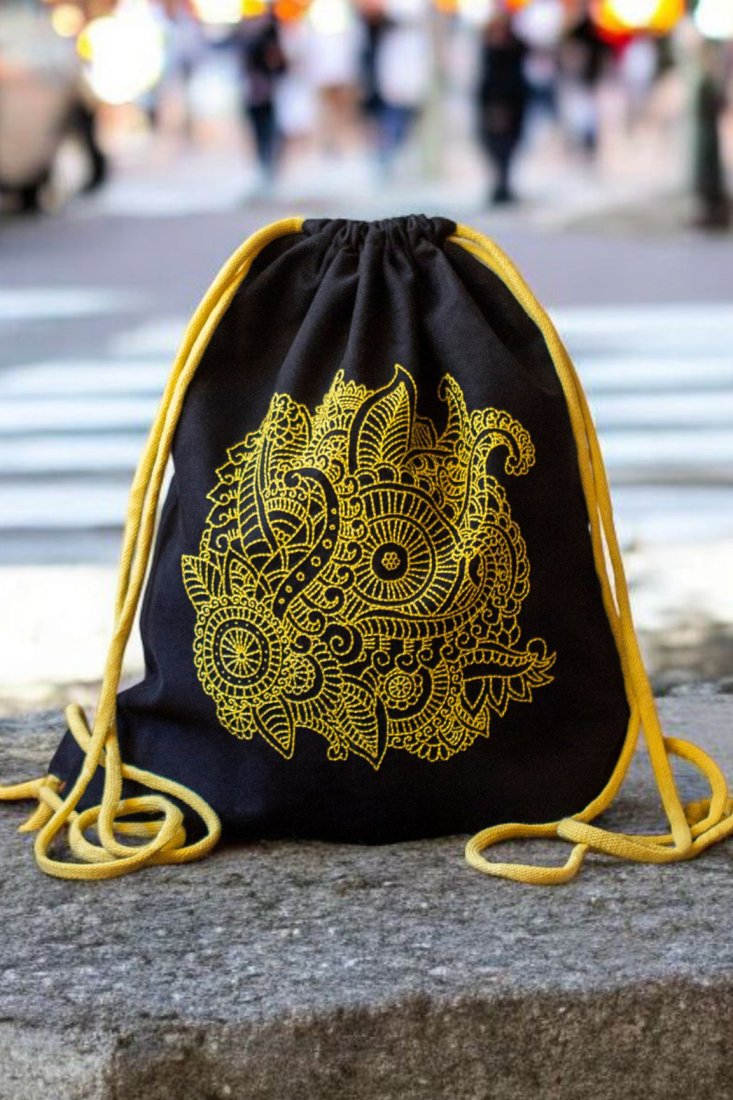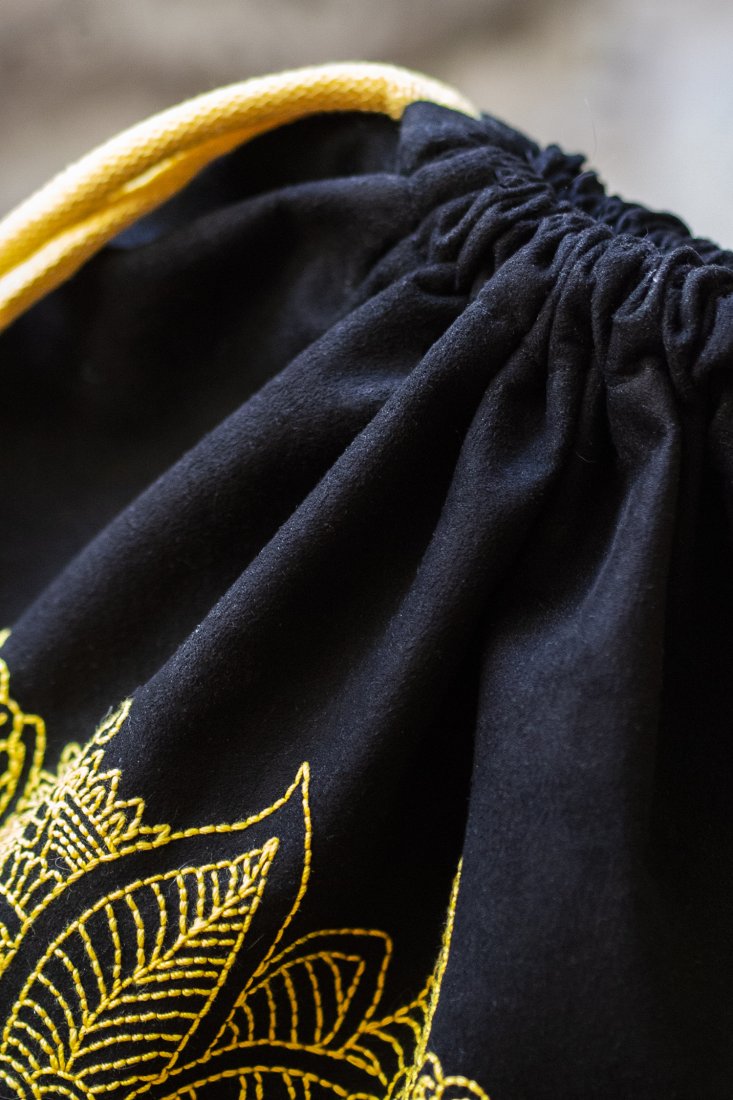 Plecak worek wykonany z nubuku w kolorze czarnym. Z przodu ręcznie haftowany, żółty wzór.