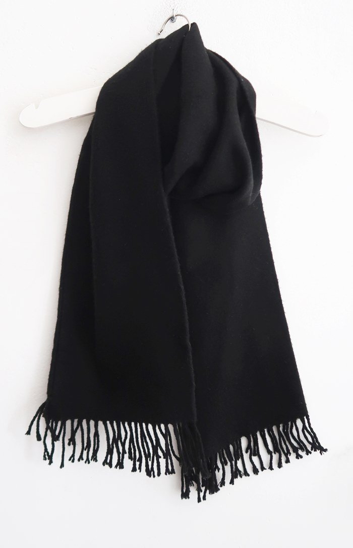 Czarny szalik z frędzlami.