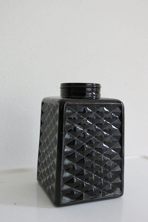 Wazon wykonany z czarnego szkła. Czworokątny.