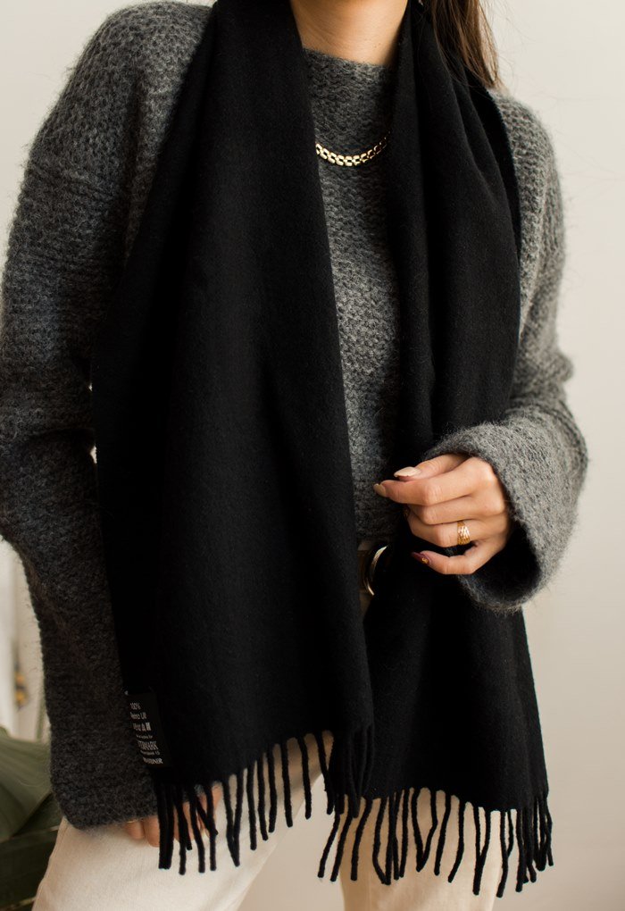 Czarny wełniany szalik z frędzlami.