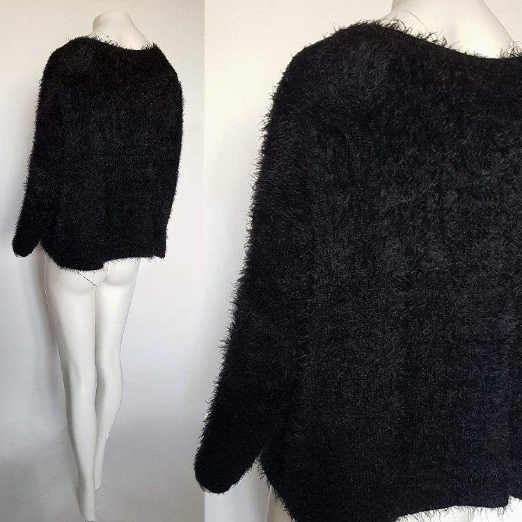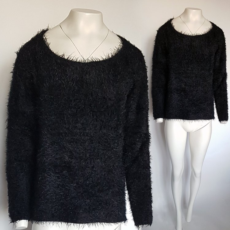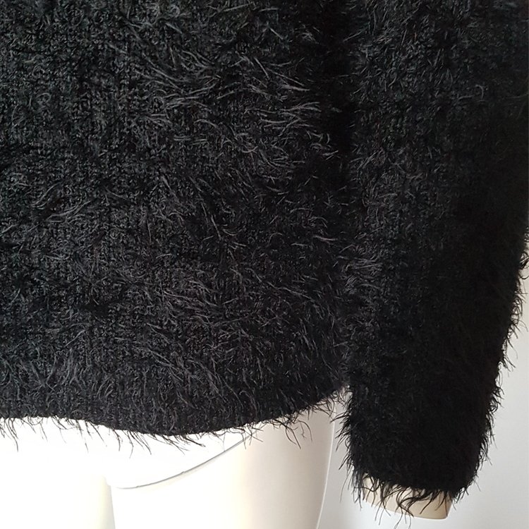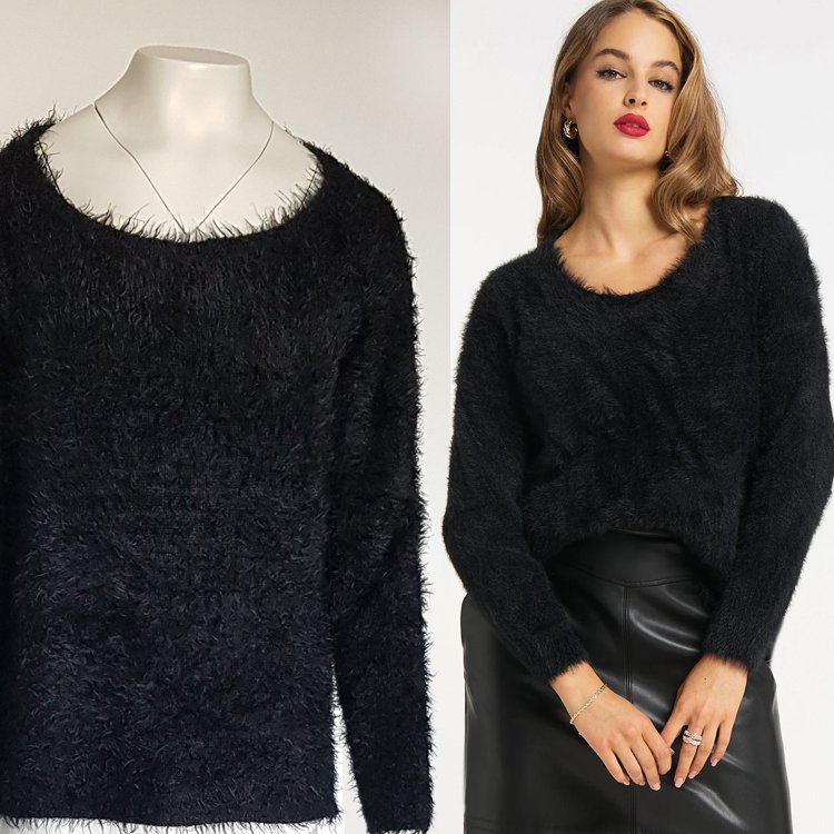 Czarny sweter z włosiem z kolekcji Heidi Klum zaprojektowanej dla ESMARA. Dekolt okrągły, głębszy, z możliwością ściągnięcia na jedno ramię. Oversizowe rękawy, wszyte poniżej linii ramion, długie, dopasowane. Dekolt, rękawy i dolny brzeg wykończone wąskim ściągaczem. Dzianina bardzo miła w dotyku.