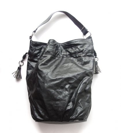 Czarna, pojemna torba na ramię. górę można regulowac za pomocąskórzanych sznureczków w tunelikach, zakończone chwostami. W środku czarna podszewka oraz trzy kieszonki ( w tym jedna na suwak). Torba zamykana na magnes. szer. 40 cm, wys. 40 cm, pasek dł. 46 cm, dno owalne. Stan bardzo dobry minus; jedynym uszkodzeniem jest lekko obtarte dno (patrz zdjęcie nr 4), jednak nie jest to rzucające się w oczy przy noszeniu. Marka H&M.