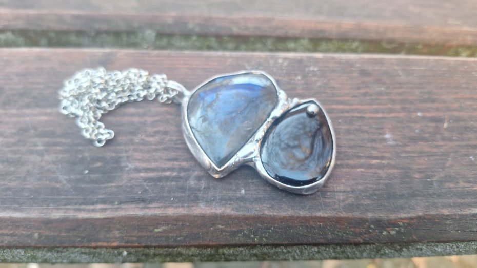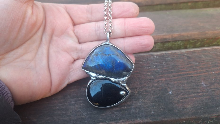 Wisiorek wykonany z miedzi, cyny, onyksu i labradorytu. Wymiary ok. 5 na 3.5 cm. Zawieszony na łańcuszku o długości ok. 50 cm.