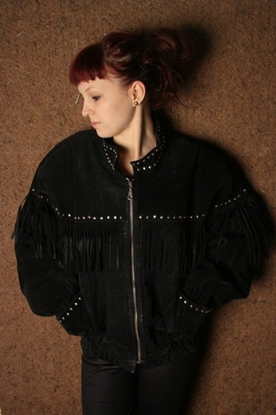 Zamszowa czarna kurtka.,NA CIENKIEJ OCIEPLINIE, Rozmiar M/L. FIRMY C&A,Stan bdb-.osoba na zdj.nosi XS/S,przy wzroscie 158cm.,
