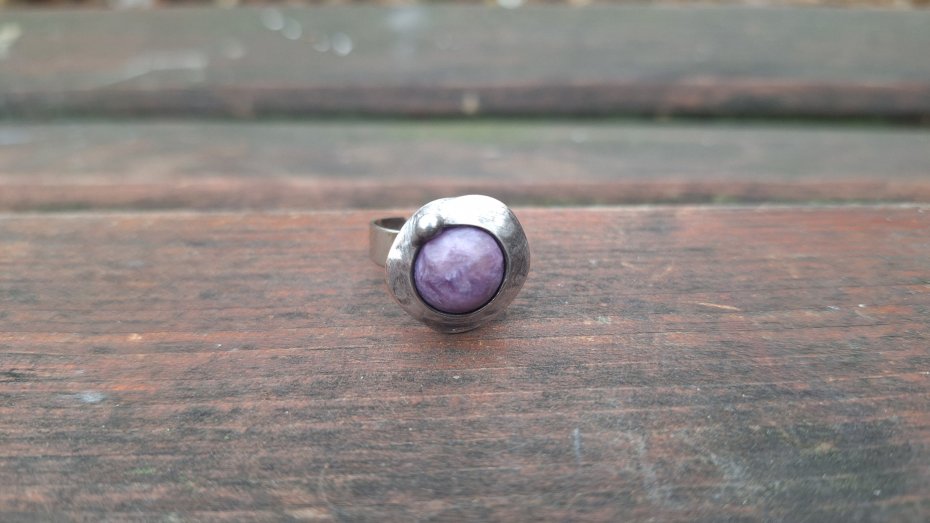 Pierścionek wykonany z miedzi, cyny i czaroitu. Wymiary ok. 1.5 na 1.5 cm. Regulowany.