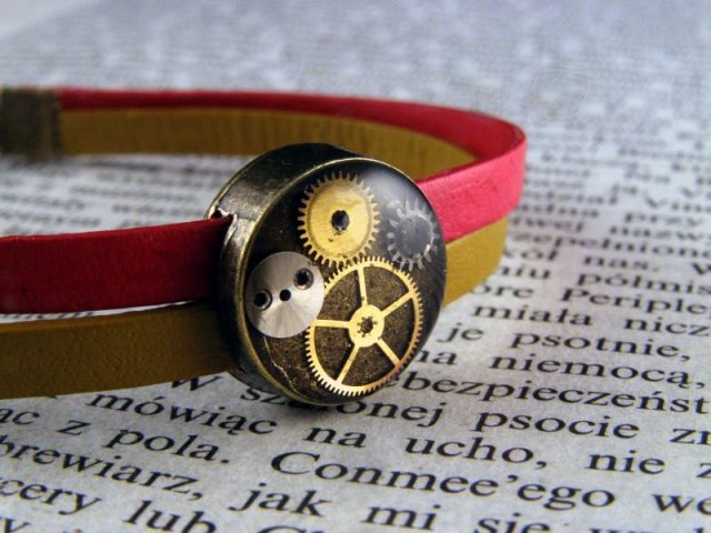 Delikatna bransoletka w stylu steampunk. Wykonana z naturalnej skóry, mosiądzu i zatopionych w żywicy zegarkowych różności. Średnica elementu ozdobnego 1,4 cm. Długość bransoletki 18 cm..