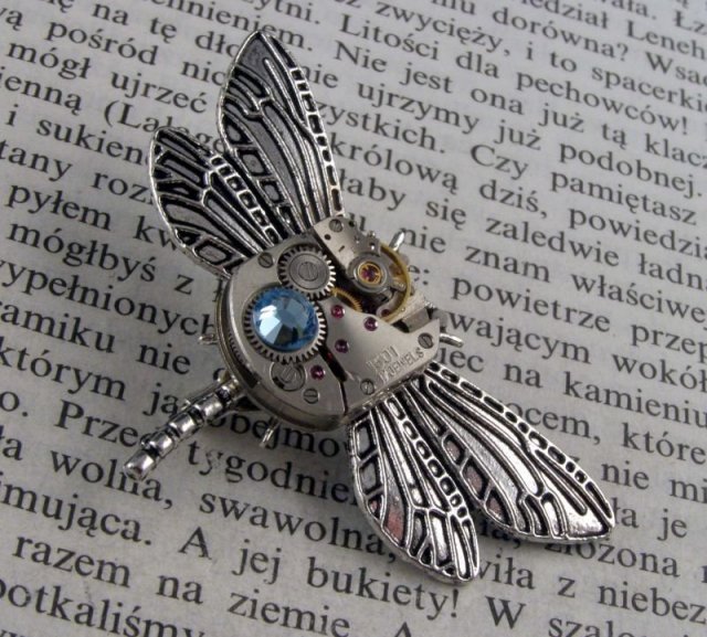 Piękna broszka w stylu steampunk. Metalowa baza w kształcie ważki o wymiarach 5 x 3 cm, oryginalny mechanizm zegarkowy i kryształek Swarovskiego.