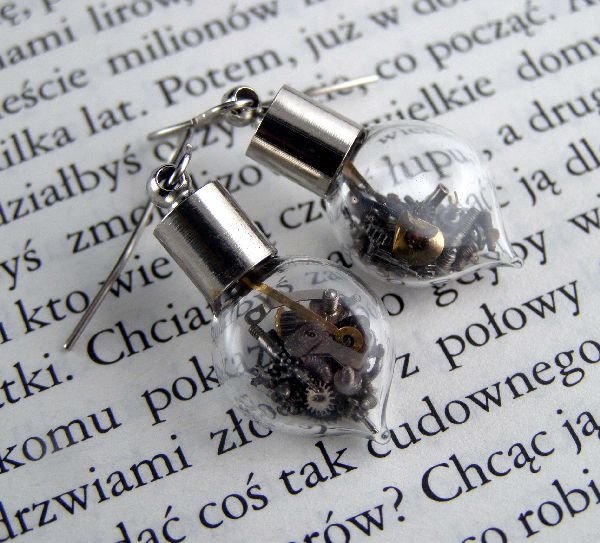 Kolczyki na czasie w stylu steampunk :) Zegarkowe różności zamknięte w malutkich szklanych bombkach. Wymiary zawieszki 3,5 x 1,3 cm.