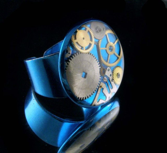 Pierścionek na czasie w stylu steampunk :) Wykonany z pięknej niebieskiej bazy i zatopionych w żywicy zegarkowych różności. Wymiary elementu ozdobnego 2 cm. Obrączka regulowana.