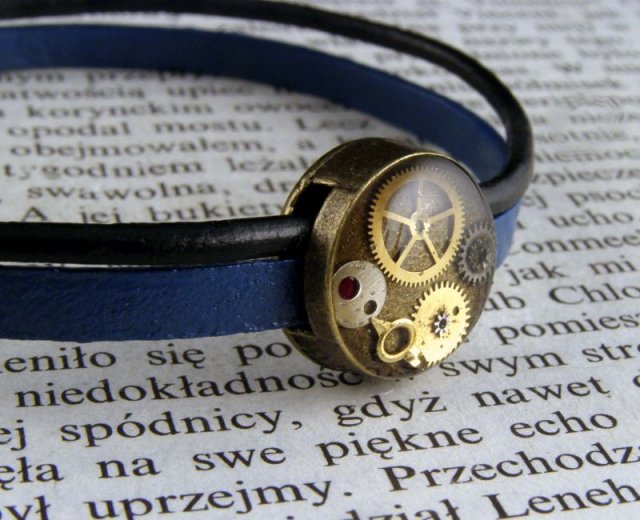 Delikatna bransoletka w stylu steampunk. Wykonana z naturalnej skóry, mosiądzu i zatopionych w żywicy zegarkowych różności. Średnica elementu ozdobnego 1,4 cm. Długość bransoletki 19,5 cm..