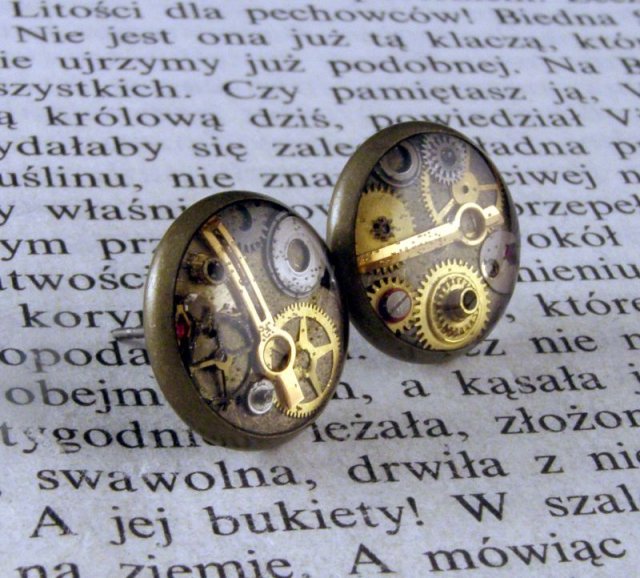 Filigranowe kolczyki w stylu stempunk. Mosiężna baza i zatopione w żywicy zegarkowe różności. Średnica 1,2 cm.