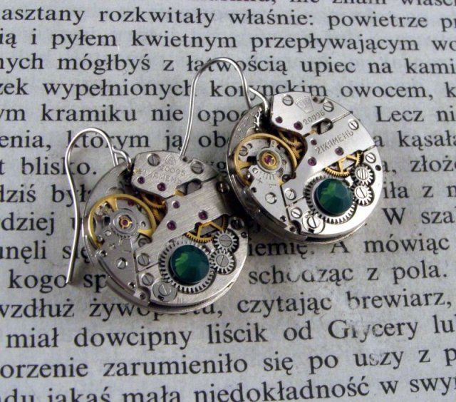 Kolczyki na czasie w stylu steampunk :) Wykonane z pięknych mechanizmów zegarkowych i zielonych kryształków Swarowskiego. Średnica mechanizmów 2 cm.