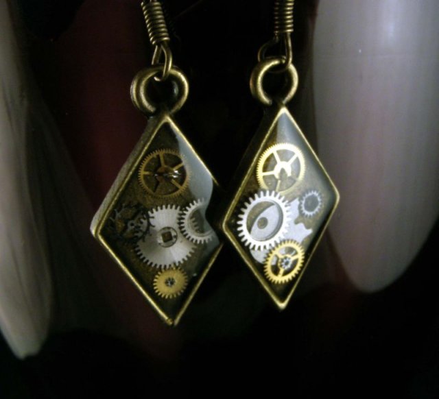 Przepiękne kolczyki w stylu steampunk, oprawa w kolorze antycznego brązu, żywica i zegarkowe różności. Długość całkowita - 4 cm.