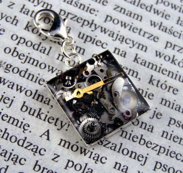 Zawieszka do telefonu lub kluczy. Metalowa baza o wymiarach 1,7 x 1,7 cm i zatopione w żywicy zegarkowe różności.