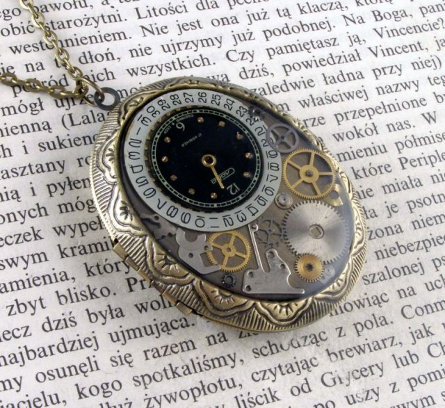 Wisiorek na czasie w stylu steampunk. Wykonany z przepięknej, mosiężnej bazy - dużego sekretnika zatopionych w żywicy zegarkowych różności. W środku - miejsce na zdjęcie. Wysokość zawieszki - 4,7 cm, szerokość - 3,8 cm. Długość łańcuszka ok 70 cm.