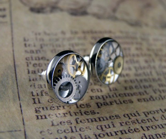 Filigranowe kolczyki w stylu stempunk. Metalowa baza i zatopione w żywicy zegarkowe różności. Średnica 1,2 cm.
