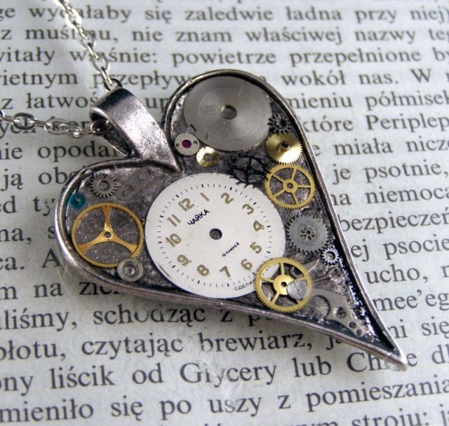Naszyjnik w stylu steampunk. serce z metalu i zatopione w żywicy zegarkowe różności. Wymiary zawieszki 4,2 x 3,2 cm, długość łańcuszka ok 70 cm
