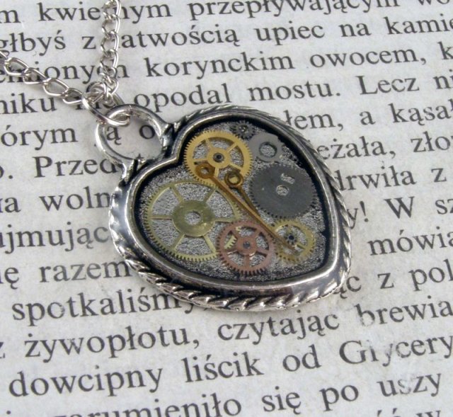 Naszyjnik w stylu steampunk. serce z metalu i zatopione w żywicy zegarkowe różności. Wymiary zawieszki 2,3 x 2,3 cm, długość łańcuszka ok 50 cm