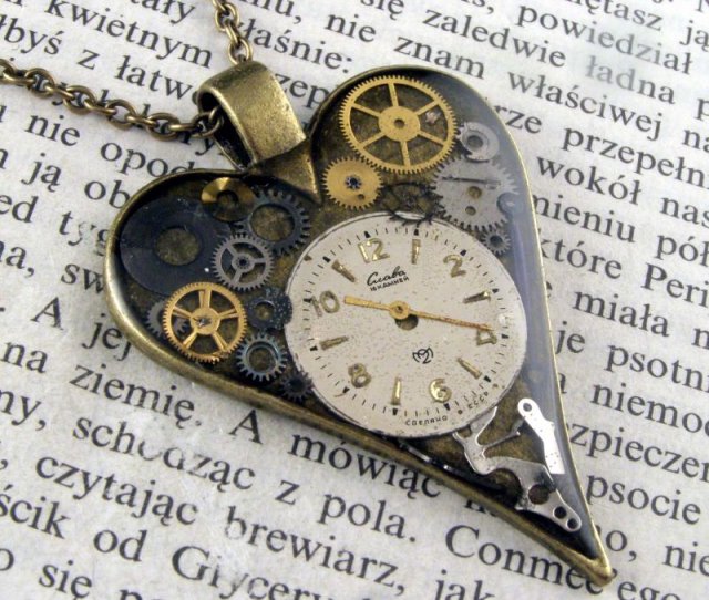 Naszyjnik w stylu steampunk. serce z mosiądzu i zatopione w żywicy zegarkowe różności. Wymiary zawieszki 4,2 x 3,2 cm, długość łańcuszka ok 70 cm