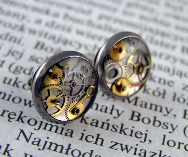 Filigranowe kolczyki w stylu stempunk. Metalowa oprawa w kolorze stali baza i zatopione w żywicy zegarkowe różności. Średnica 1,2 cm.